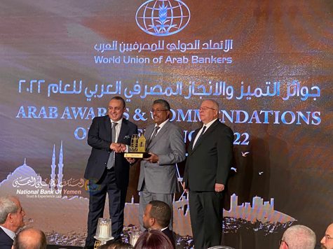 | The World Union of Arab Bankers (WUAB) honored the National Bank of Yemen for the fourth consecutive year at its annual ceremony held on Wednesday evening, November 20, 2024, in Cairo, Egypt. During the ceremony, the Union's annual awards were distributed to prominent banking figures, distinguished Arab banks, and financial institutions during 2024. Dr. Ahmed Ali Omar Bin sankr, General Manager of the National Bank of Yemen, a member of the Board of Directors of the Union of Arab Banks and a member of the International Arab Bankers Union, was honored to receive the Excellence Award as the Best Bank in Yemen and the Strongest in Implementing Financial Inclusion. It is worth noting that the National Bank of Yemen has been recognized for four consecutive years as the Best Bank in Yemen and has received several banking awards in recent years, including the 2021 Arab Banking Achievement Excellence Award for the Best Bank and its excellence in implementing its development and modernization project under exceptional circumstances. The emergence of the National Bank of Yemen at the forefront of Arab banks is a clear indication of what the bank has acquired and distinguished itself with its banking professionalism, experience and trust that characterize a bank with over 55 years of experience in the banking field. It is a clear indication of the capabilities, management and employees of the bank who have achieved numerous accomplishments over decades. How wonderful it is that the slogan of this bank, "experience and trust," is associated with its accomplishments in light of the difficulties facing the banking sector at the national level, at the level of the international banking system and the stages that the economies of countries around the world are passing through. However, the National Bank of Yemen has always proven that it is the Yemeni banking edifice that we can trust and rely on, in all circumstances. We wish the National Bank of Yemen continued success and excellence and to continue providing the best and distinguished services to its customers who have always trusted it due to its experience in the banking market, the security that it enjoys and its fulfillment of all its obligations towards its customers. We congratulate the National Bank of Yemen on these achievements and this distinction that distinguishes it. For his part, Dr. Ahmed bin sankr, the Bank's General Manager, expressed his great happiness with the continued excellence of the National Bank, and that this is truly what its employees and members deserve, wishing the Bank to always be honored and distinguished in Arab and international forums, stressing its well-known position among Arab banks and at the international level, and that with this honor, the strength, solidity and position of this leading bank appear. The Bank's honoring did not come out of nowhere, but rather from the solidity and strength of its financial position, which is met with appreciation and honored in a manner befitting its position. The Bank has become aiming to achieve this and the best in the future, regardless of the difficulties. On this celebratory occasion, the National Bank congratulates the Prime Minister, Dr. Ahmed Awad bin Mubarak, the Minister of Finance, Mr. Salem bin Braik, and the Bank's Board of Directors, its employees and all its customers on this honor, and for their continuous support to the Bank in order to achieve achievement after achievement. *Sabanet |